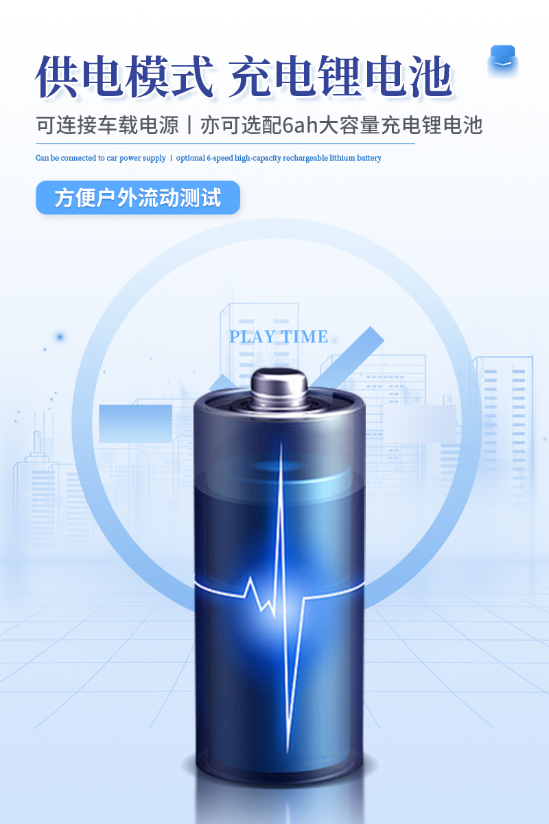 9.供電模式:儀器交直流兩用,直流12V供電(標配),可連接車載電源,亦可選配6ah大容量充電鋰電池,方便戶外流動測試。