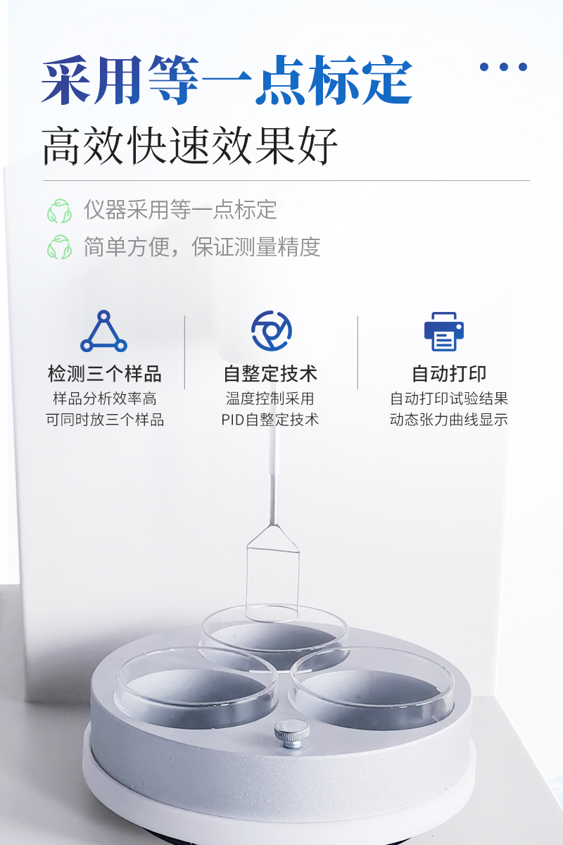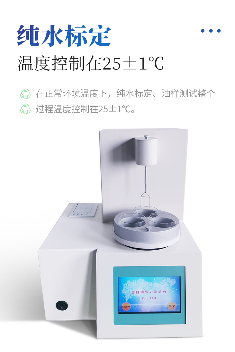 儀器特點★ 在正常環境溫度下,純水標定、油樣測試整個過程溫度控制在25±1℃。★ 溫度控制采用PID自整定技術★ 樣品分析效率高,可同時放三個樣品★ 使用不同測量環儀器自動修正參數★ 自動打印試驗結果,動態張力曲線顯示★儀器采用等一點標定,簡單方便,保證測量精度;★高清晰彩色觸摸