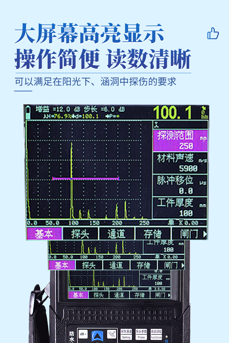 大屏幕高亮顯示,可以滿足在陽光下、涵洞中探傷的要求。