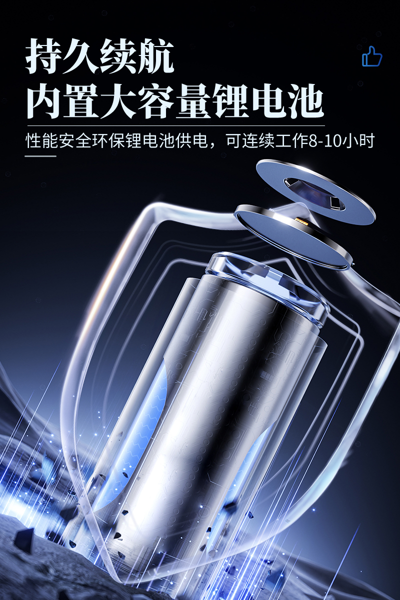 ● 性能安全環保鋰電池供電,可連續工作10小時。